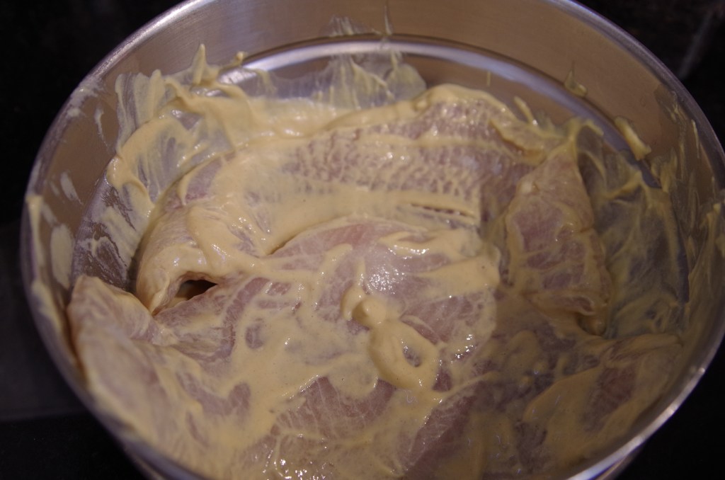 In a large bowl coat the catfish with the yellow mustard. (This was shocking to me. No egg or buttermilk?!)