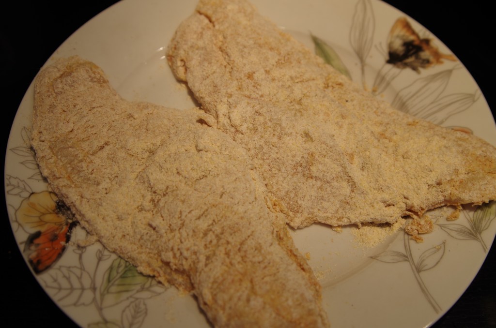 Mix together the cornmeal, flour, seasoning salt, paprika and black pepper and gently coat each fillet.